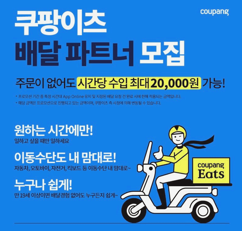 본 음성은 인공지능 성우 서비스 타입캐스트에서 제작되었습니다 쿠팡이츠. '쿠팡이츠 배달파트너' 애플리케이션(앱)을 깔고 본인 차량을 등록하자 곧바로 배달이 가능했다.